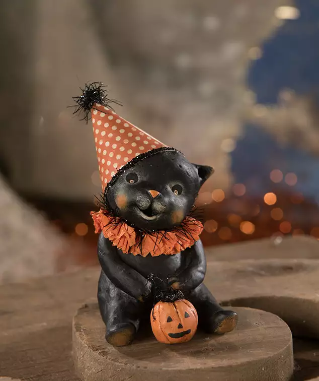 - Hand-painted paper pulp, crepe paper collar, paper hat, tinsel accent