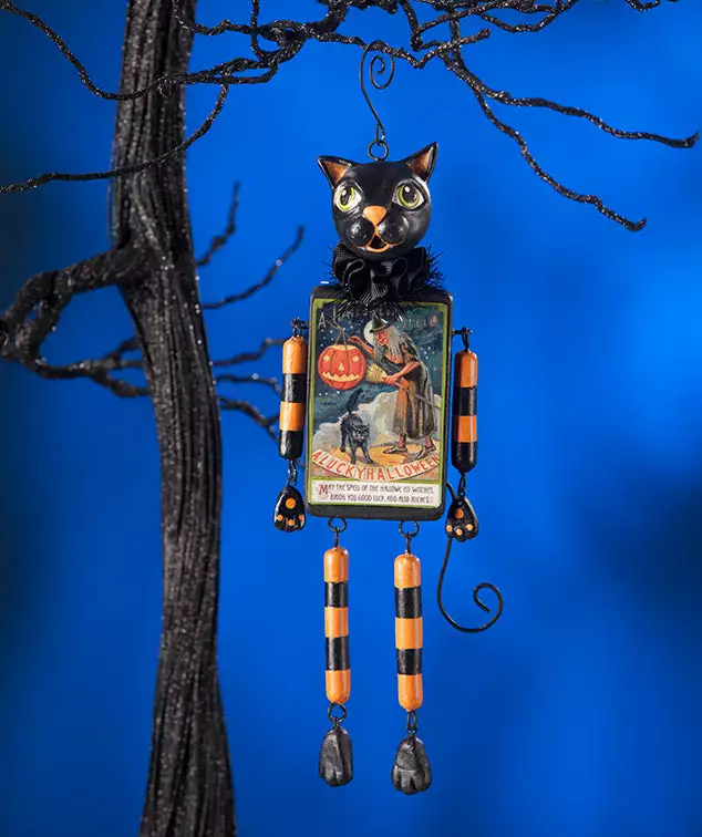 Black Cat dangles his arms and legs. He’s ready for a happy haunt with his dangler buddies, Skelly, Pumpkin and Ghostie.