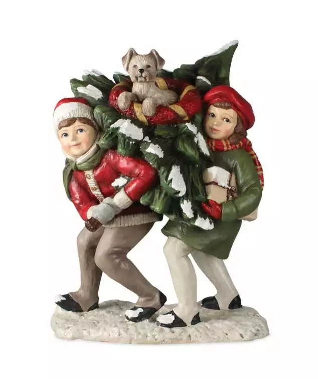 Create a festive Christmas display with Bringing Home the Tree Figurine inspired by the Saturday Evening Post.