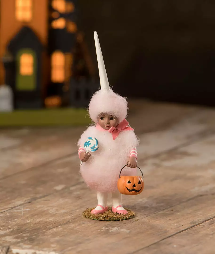Adorable Cotton Candy Demi is holding her jack-o-lantern bucket and lollipop treat. Her childlike excitement is contagious. Arrange with other Halloween trick-or-treating figurines for a unique Halloween scene.