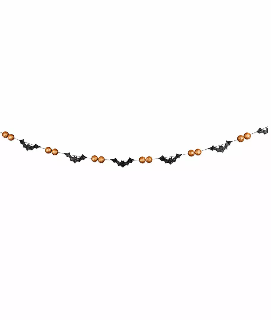 Make your Halloween party sparkle; swag this glittered orange ball and black bat garland on a tree, hutch, mantle, or chandelier.