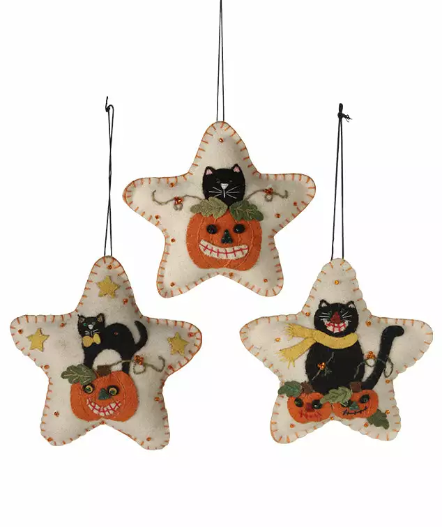 Give your Halloween decorating a light-hearted feel with these amusing appliqued Kitty Cat Star Ornaments.