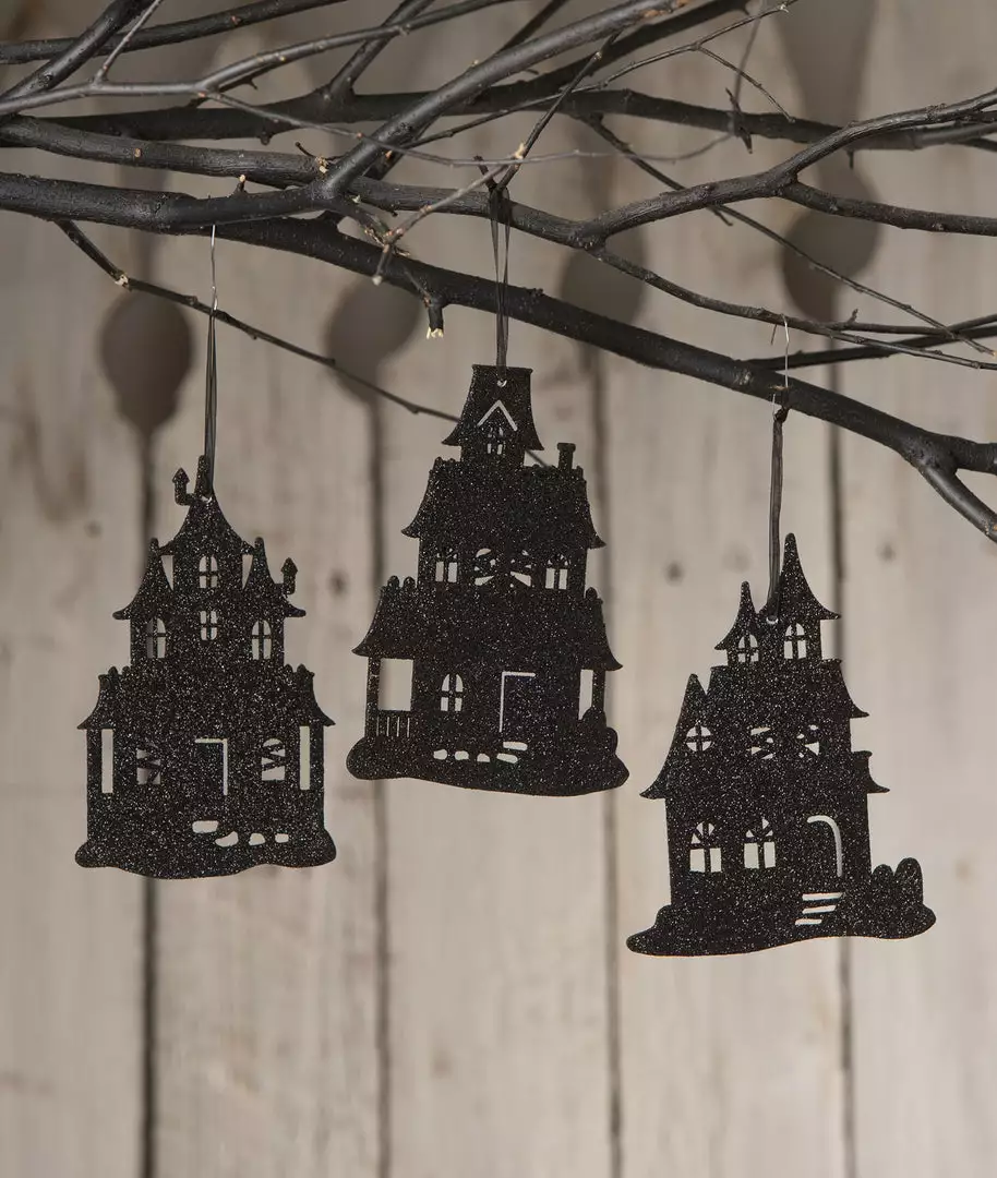 Give your Halloween decor haunting appeal with these sparkling black glittered Haunted Houses Silhouette Ornaments.