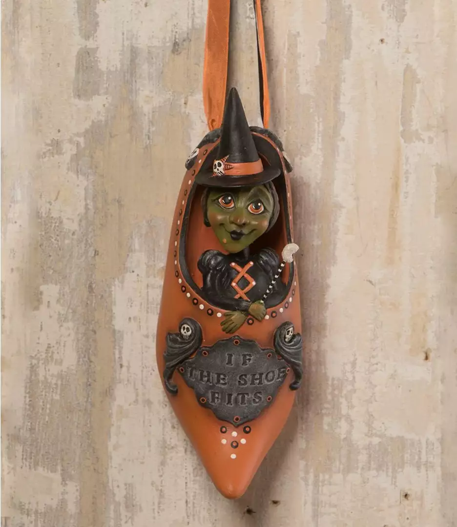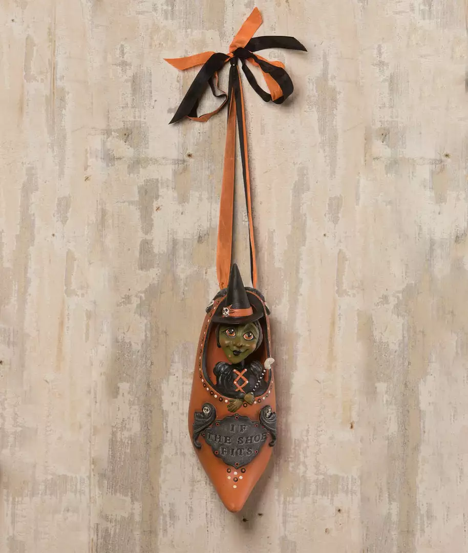 Greet your Halloween guests at the door with a chuckle. This Zany Witch in a shoe will put a twist on an old time message to say,