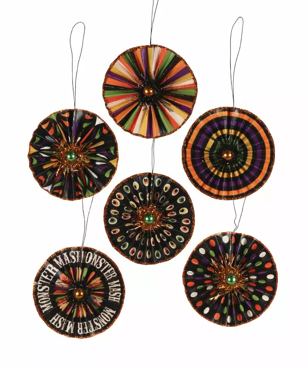 Monster Mash Rosettes have a fun party kaleidoscope effect. Razzle dazzle your event with pleated paper tinsel circles, glitter, and beads.