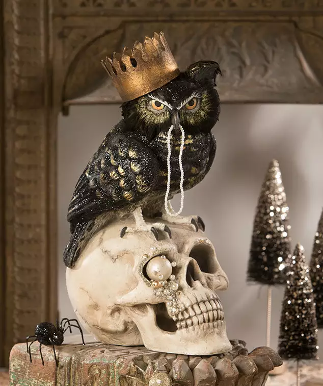 - Hand-painted resin, feathers, pressed paper, beads, glitter, and sequins