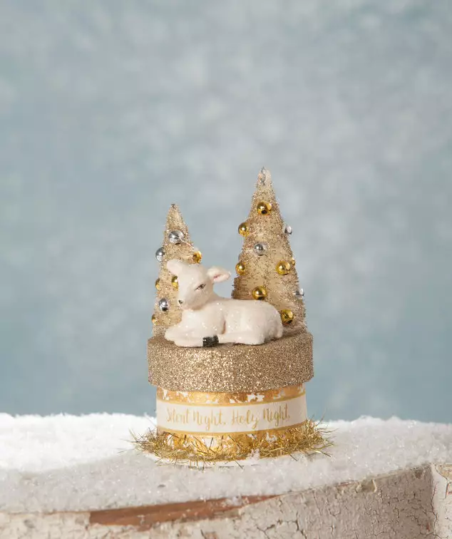 Bring a sweet touch to your Christmas decorating and gift giving with this lovely Silent Night Little Lamb Box with tinsel, bead, glitter, and bottle brush tree embellishments.