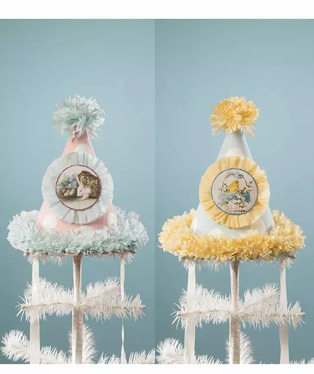 Add a vintage-inspired feel to your Easter decor with these bunny rabbit and chick party hat displays.