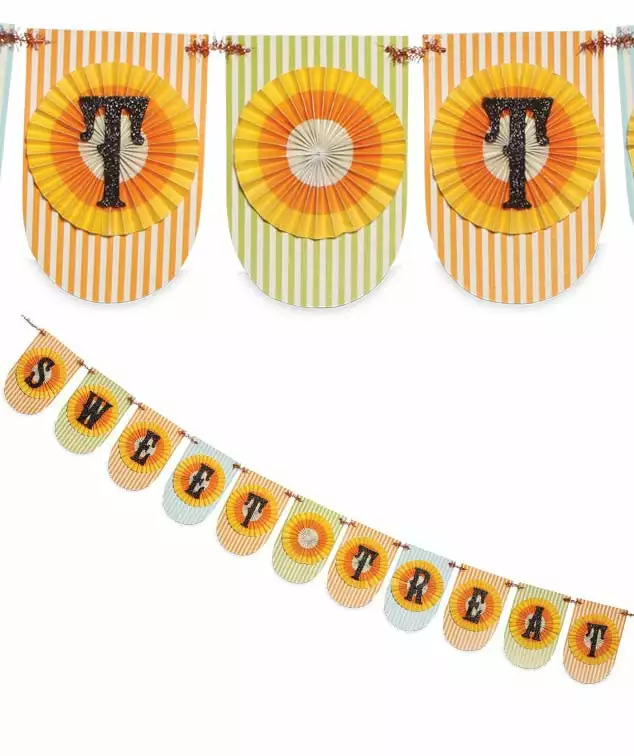 Drape this colorful and fun striped Sweet Treat Garland with black glittered letters over a candy buffet or swag on a party table.