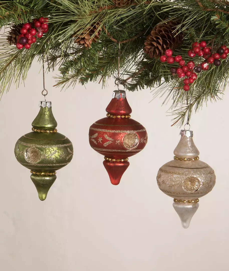 Trim your tree with an old fashioned feel with these antiqued red, green, and cream Vintage Finial Indent Ornaments.