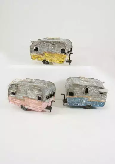 Prop these fun vintage style tin holiday camper ornaments, embellished with glitter in your Christmas village or in your Christmas Tree.