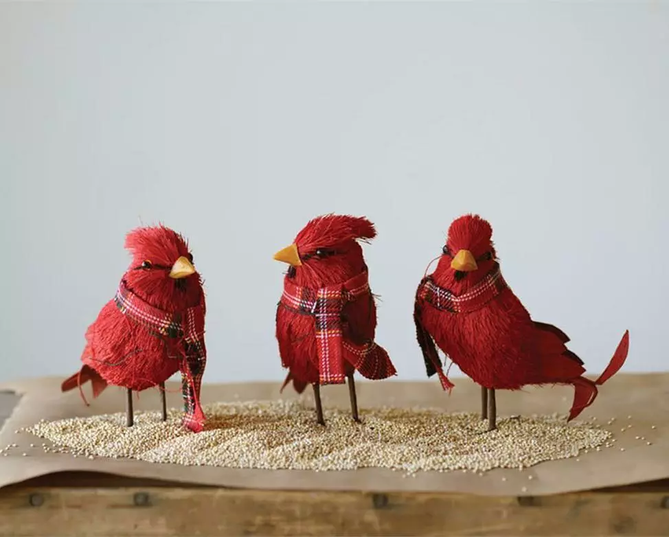 Dress up your home for Christmas with these fun red bottle brush cardinals dressed in holiday plaid scarfs.