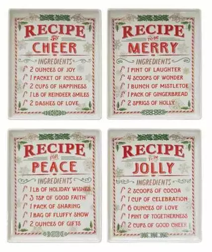 Serve up the recipes for Christmas cheer, merry, peace, and jolly to your table with this whimsical set of stoneware plates.