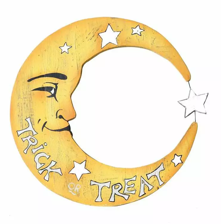 A grinning crescent moon trick or treat sign made from wood. Display in a covered front porch to greet your trick or treaters.