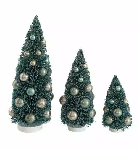 Vintage Blue Bottle Brush Trees in different height and levels add visual interest to any Christmas scene. All decorated and ready for your putz house winter landscape. With blue-green and aged silver color balls!