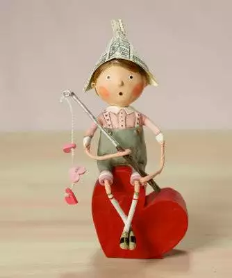 An adorable figure fishes for love using hearts as bait. This cute figurine sits on a heart stand.