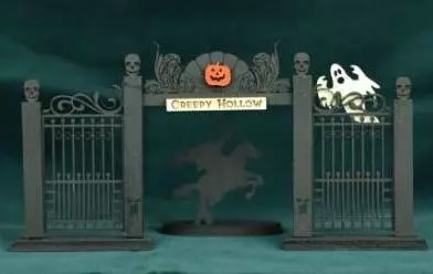 Give your Halloween tabletop display a haunting effect with this intricately designed wooden cemetery fence and headless horseman silhouette set inspired by the Legend of Sleepy Hollow.