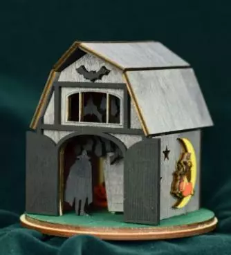 Give small tabletop Halloween displays a haunting effect with this curiously chilling Haunted Bat Barn. Made from light-weight balsa wood, this small Haunted Bat Barn display is big on detail. Frightfully detailed with 15 bats, 2 cats, a ghost, a witch, and a jack-o-lantern.