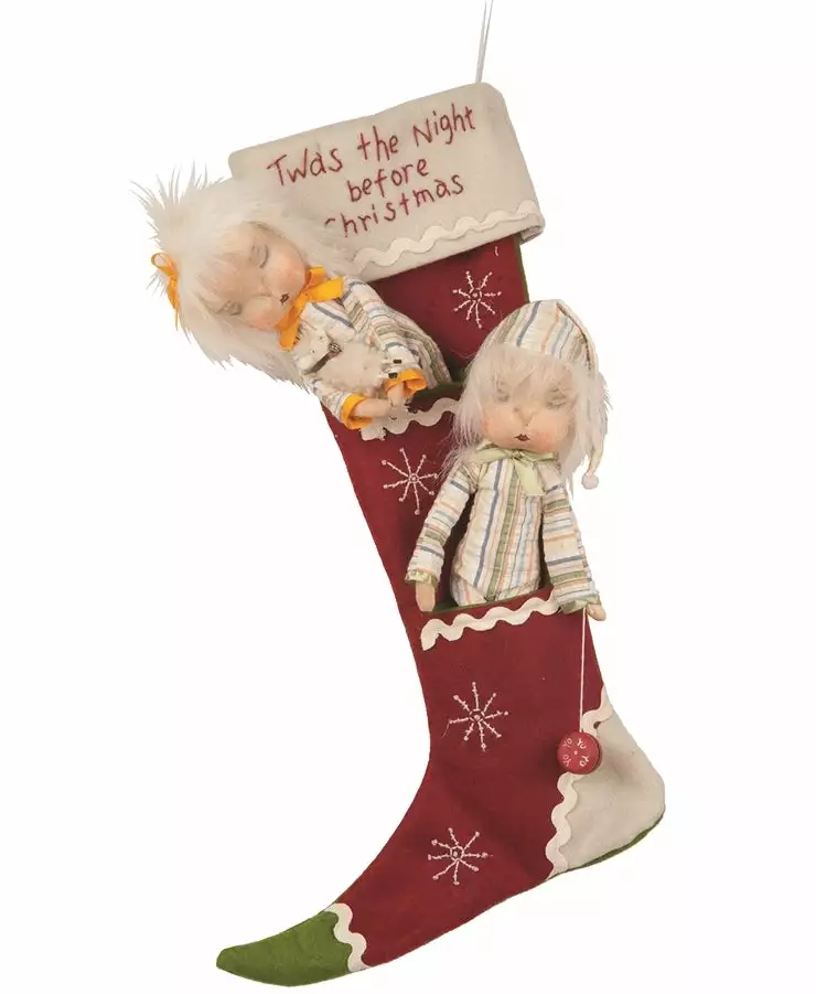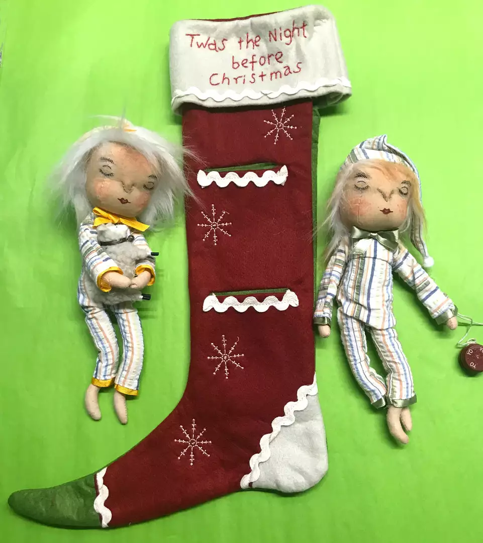 Twas the night before Christmas…..Dilly and Dally are sound asleep dreaming of Christmas morning. Create a magical Christmas display with this adorable stocking and little dolly duo.