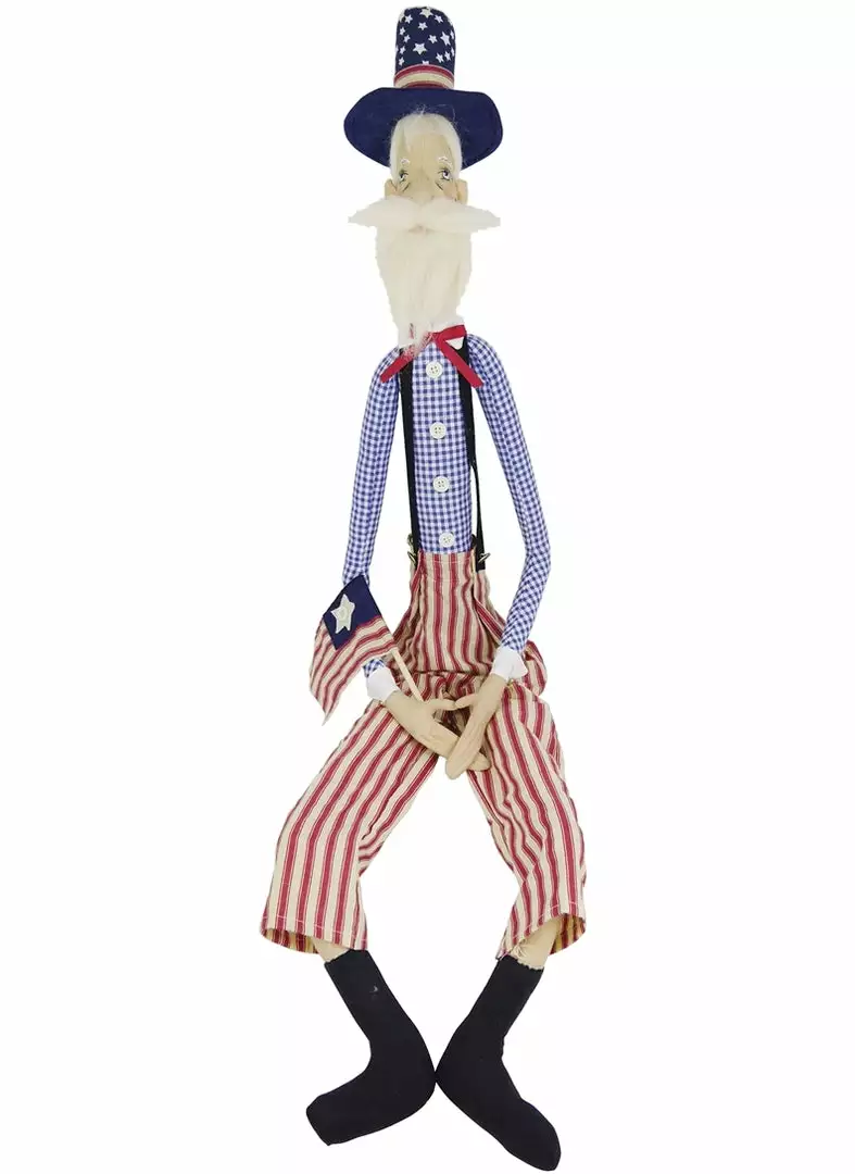 Uncle Sam is a true patriot and a tall drink of water. He stands out in a crowd waving his flag. Uncle Sam is ready to give his speech at the towns’ bandstand podium. Freedom Sam is dressed in red striped pants, white star hat, and blue check patterned outfit. Sit Freedom Sam on a wooden chair for Americana flair.