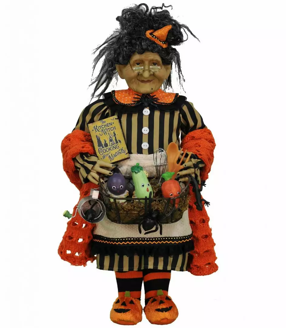 Kitchen Witch likes to get comfy in her pumpkin slippers while cooking.
