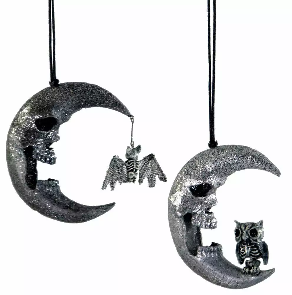 Angry haunting glitter moons are giving owl and bat a little night scare! For flying around them how do they dare? Hang on your Halloween tree, ceiling, chandelier, or tie them on a wreath. A must have for all our moon collectors.