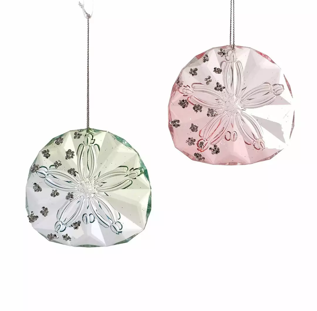 Create a coastal theme; hang these faux crystal sand dollars in your window or holiday tree.