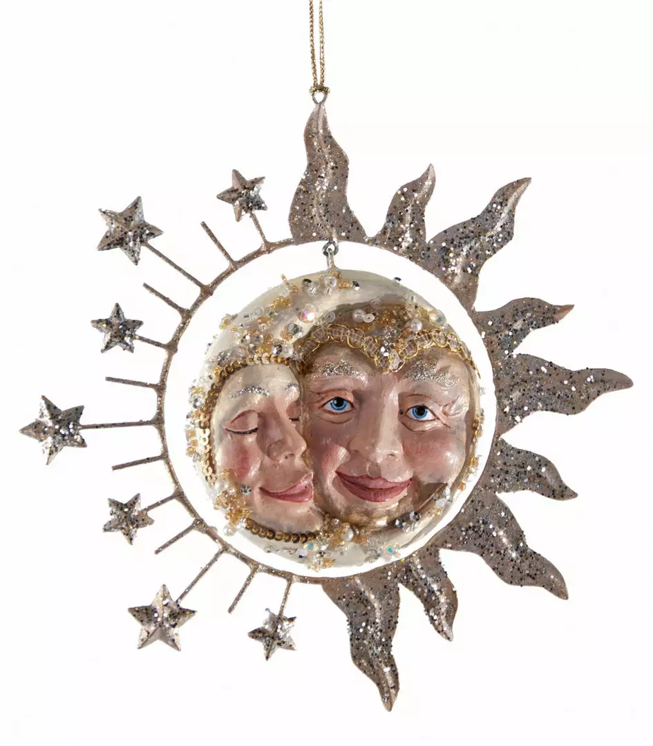 The moon embraces the sun in this celestial ornament with year round appeal.