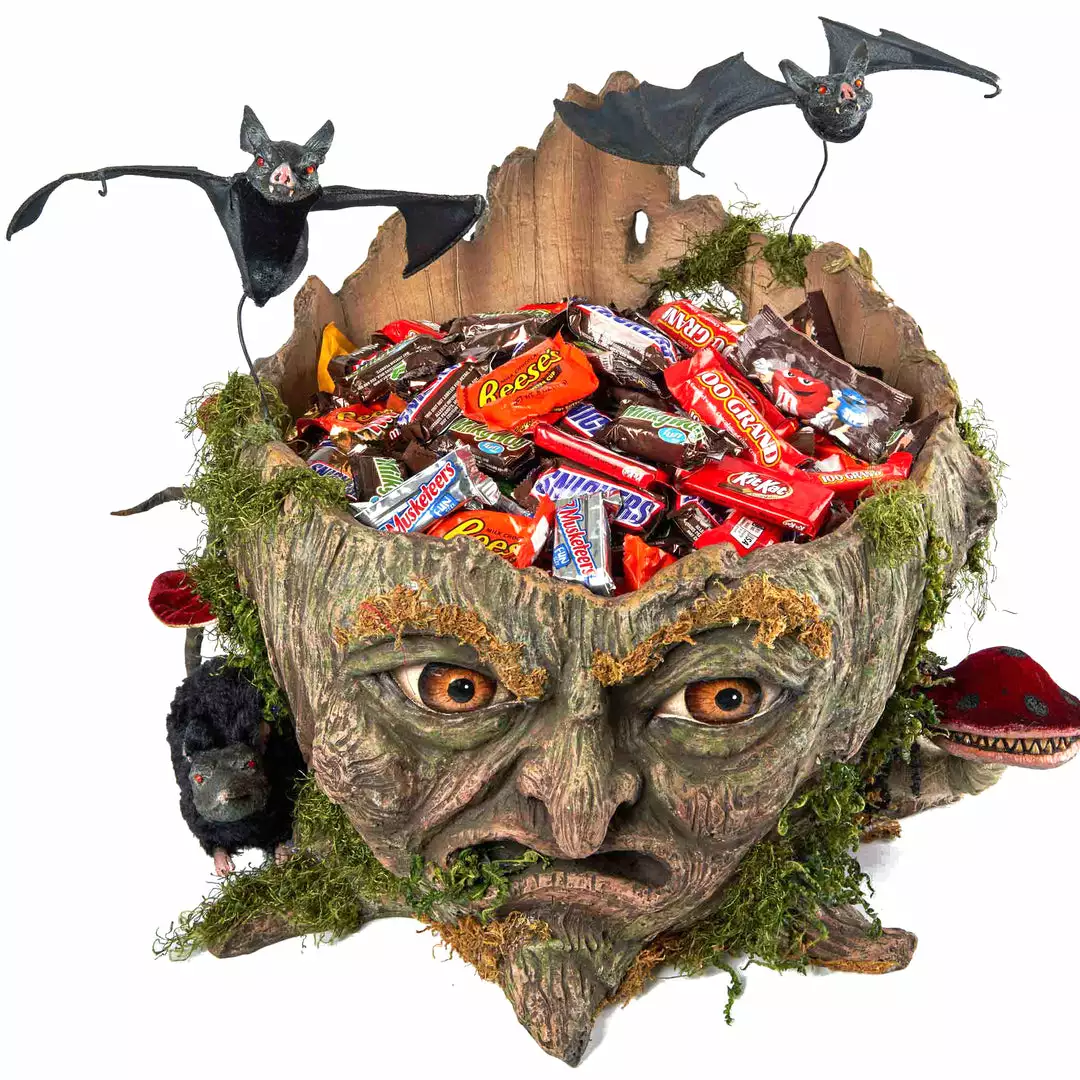 Walter Woodard Tree Stump comes to life brimming with the details you would expect from the artists at Katherine’s Collection. From his highly detailed facial expression to swirling bats, a scary rat, and a grinning mushroom. Walter Woodard Tree Stump treat container will add an unexpected haunting effect that your Halloween party guests won’t soon forget.