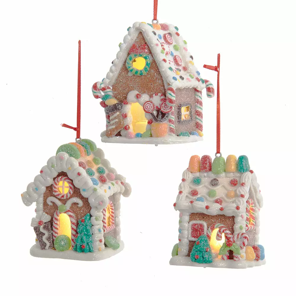 Trim your tree with sweet delight with these sugar glittered Gingerbread Candy Cottage Ornaments that light up.