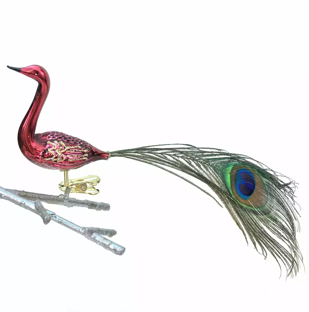 - Mouth-blown glass clip-on bird ornament with feathers.
