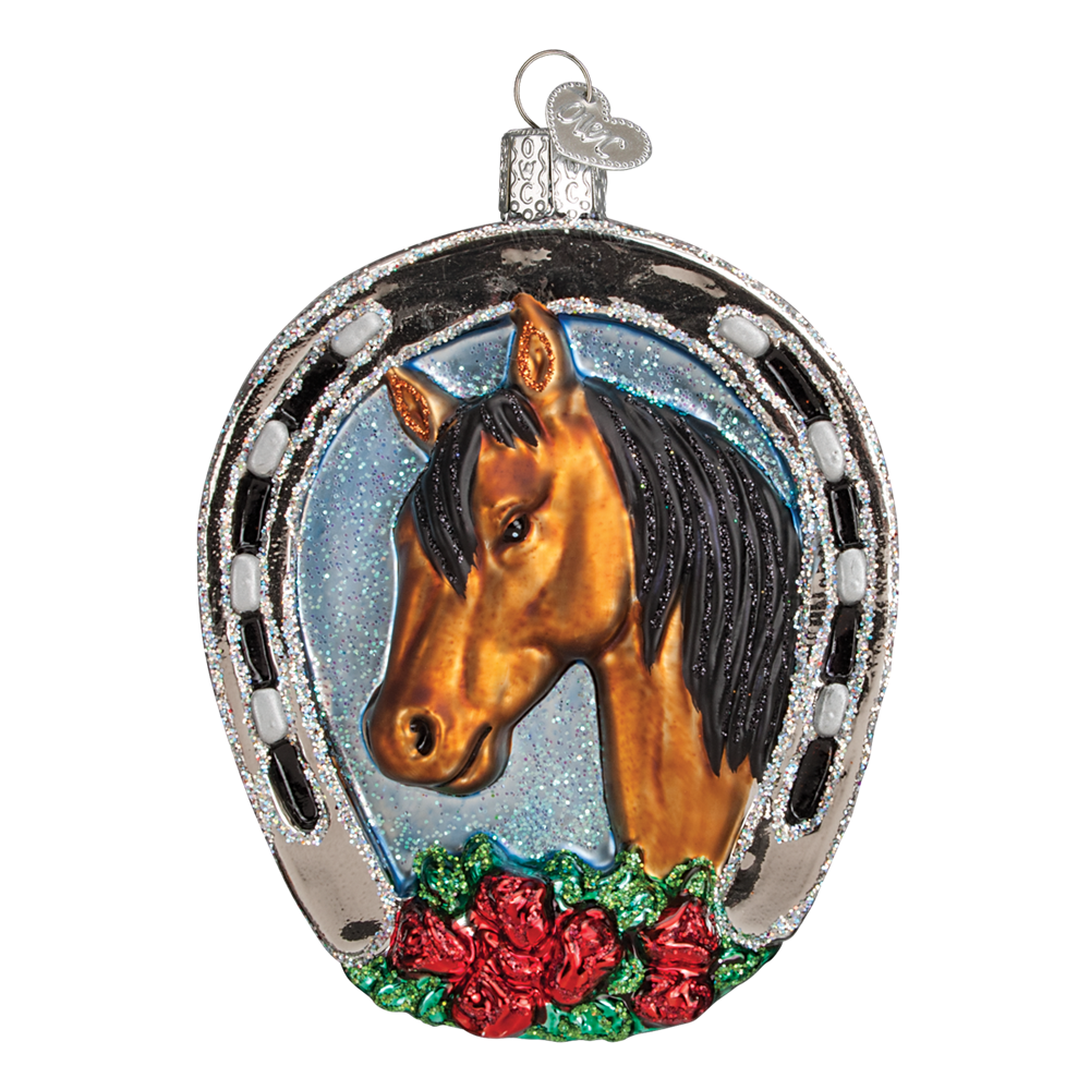 - 4″ Glass horse in horseshoe ornament.