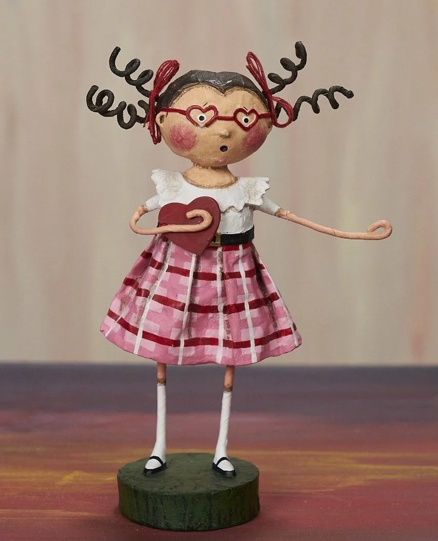 Get nostalgic with this whimsical Valentine’s Day school girl figurine designed by artist Lori Mitchell.