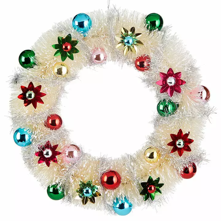 This festive Ivory Bottle Brush Wreath with Foil Ornaments will make a cheerful addition to your Christmas decor.