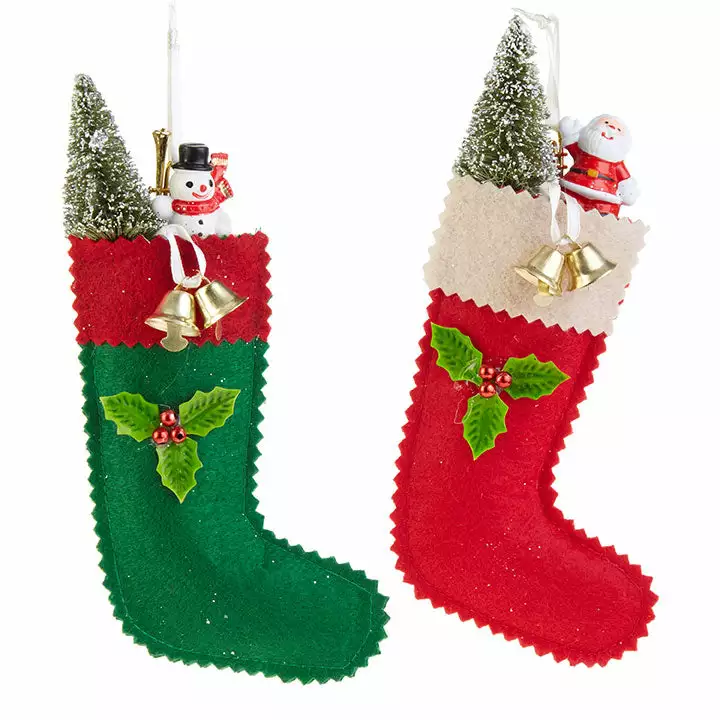 A Santa and Snowman surprise are on their way, ready to make your day. Red and green zigzag patterned felt filled stockings with bottle brush trees and Santa and snowman figurines. Give your Christmas decorating a vintage feel with these Christmas Craft Fair Felt Stocking Ornaments.