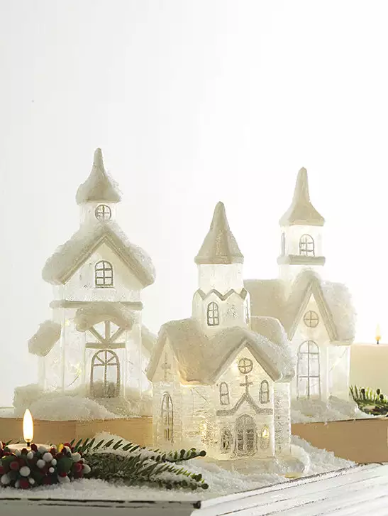 Illuminate your Christmas decor with these pretty Snowy Glass Churches with Lights.