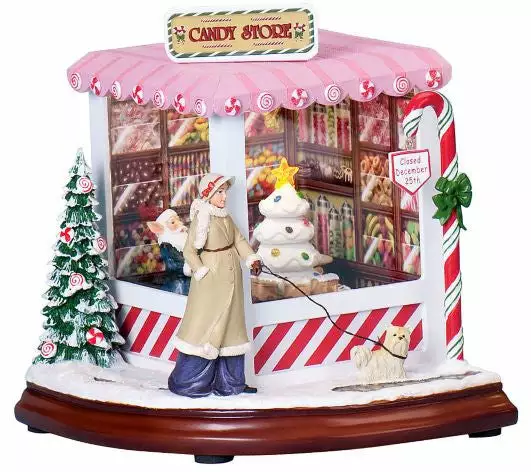A Nostalgic musical Christmas shop illuminates to reveal a moving train. Plays various Christmas Music.