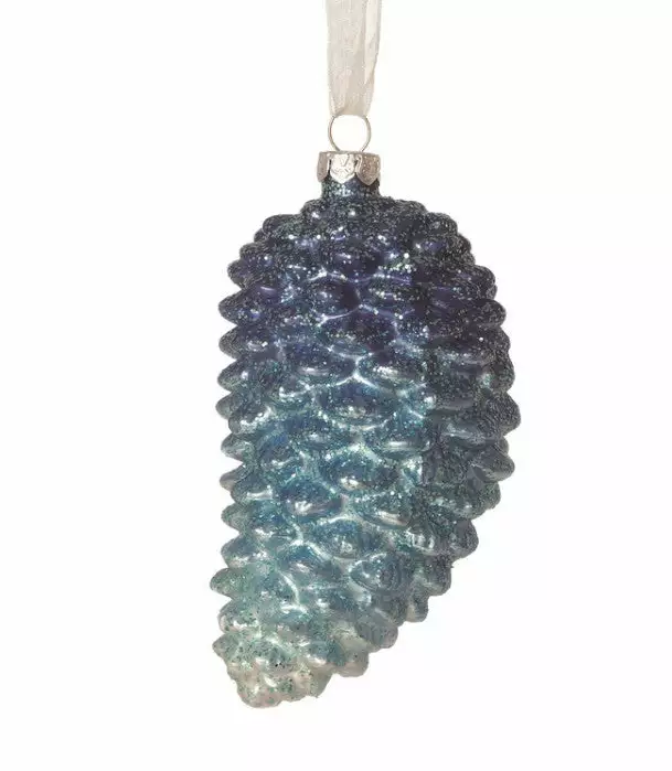 Glass pinecone ornament with graduating shades of blue and sparkling glitter accents. Pair with our Blue Ombre Skinny Pinecone Ornament for visual interest.