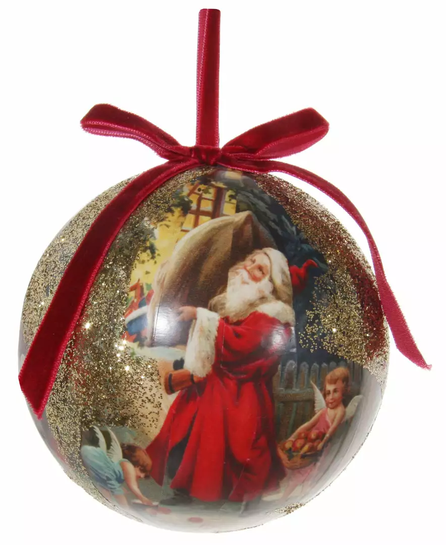 Bring a Victorian touch to your Christmas decor with this decoupage ball ornament with a lovely scene of a heavenly Santa with angels.