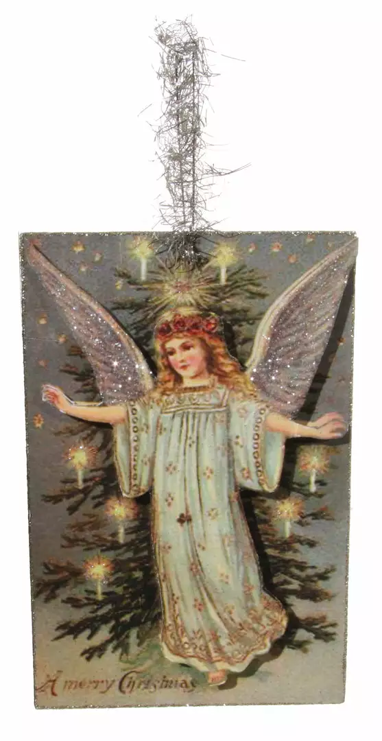 Lend a vintage feel to your Christmas decorating and gift giving with this lovely paper angel postcard ornament with tinsel hanger and glitter embellishments.