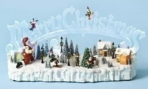 Santa and his elves have worked very hard this year carving this Merry Christmas ice sculpture to brighten the Christmas spirit. Joy will abound while gazing at this magical Christmas village lit up atop an iceberg as elves play Christmas Music.