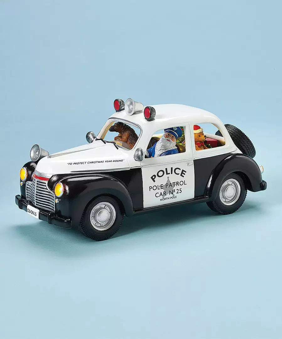 Santa Driving a North Pole Retro Police Car with K-9 friend and teddy bear in tow.