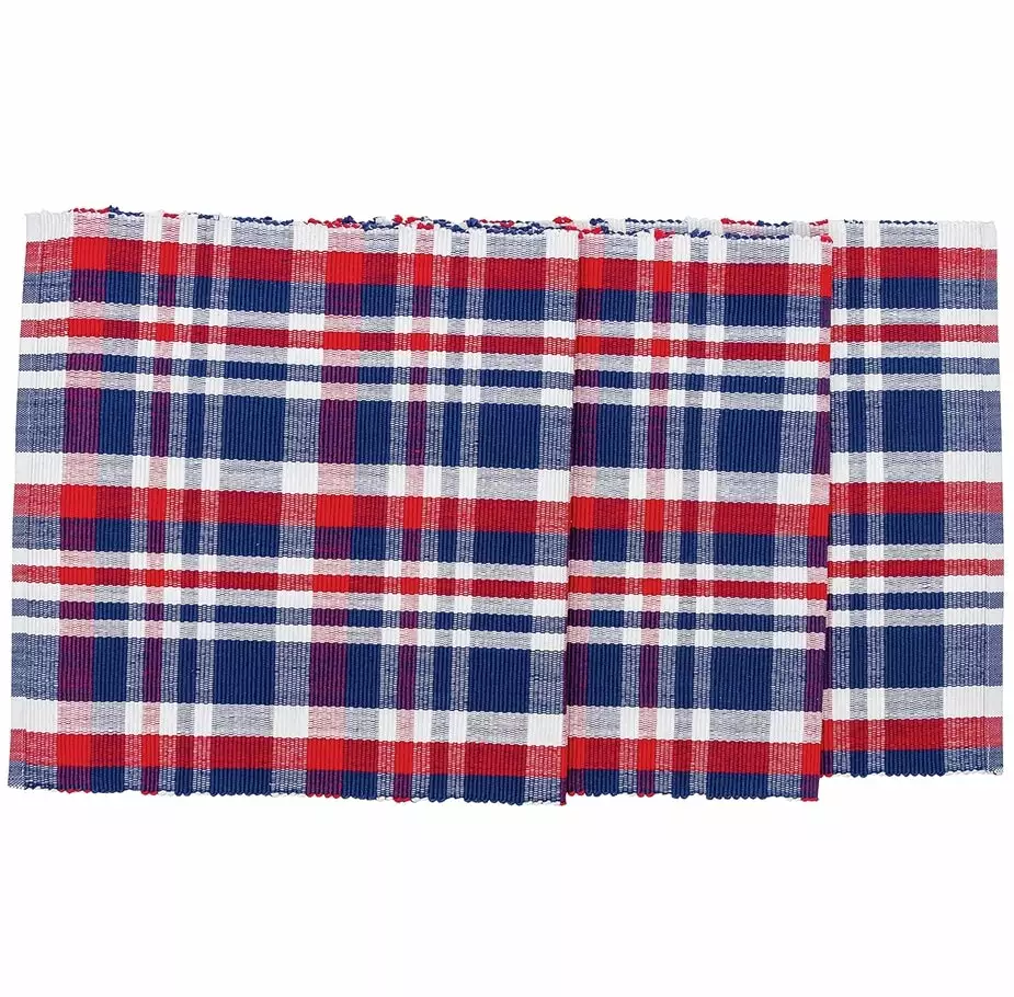 Instantly add a splash of patriotism to any table with this cotton red, white and blue plaid table runner.