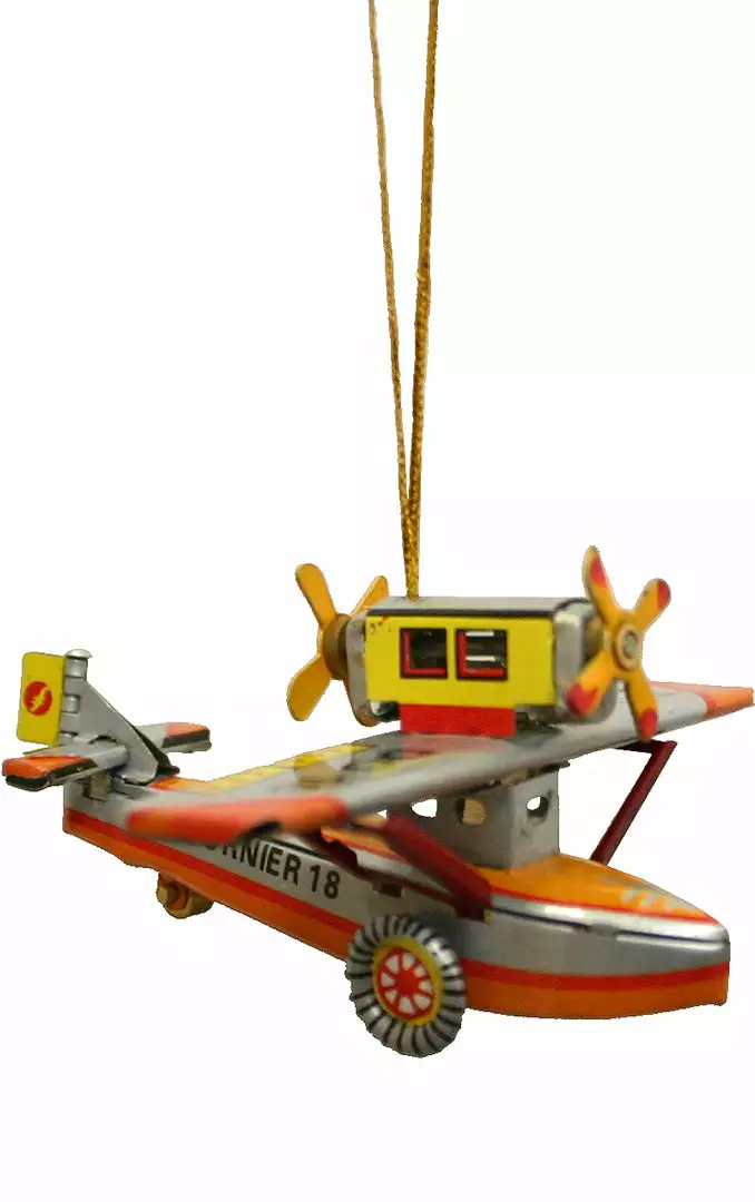 Add nostalgia to your Christmas decorating with this Tin Toy Sea Plane Reproduction Ornament reminiscent of tin toys of yesteryear.
