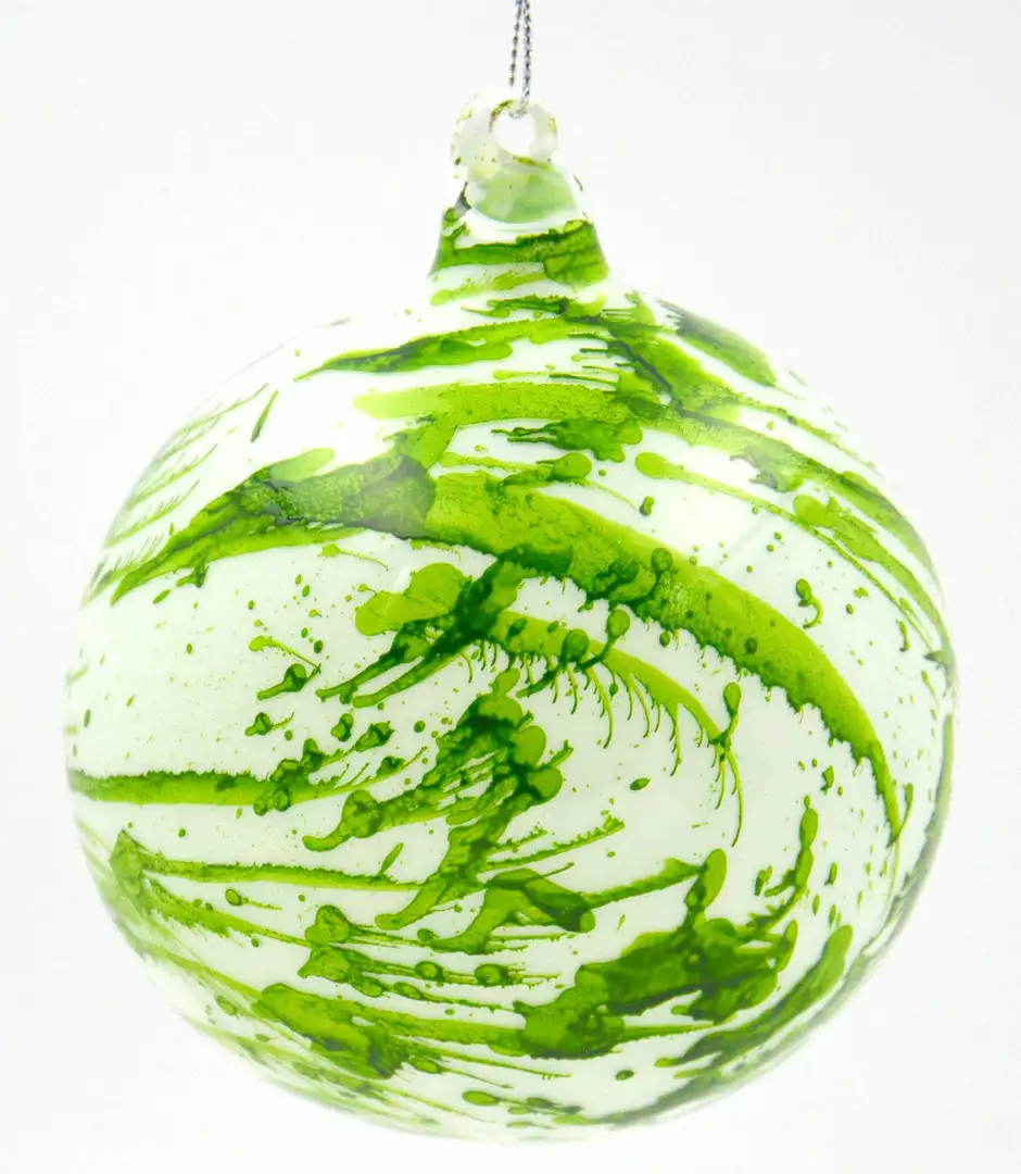 Get artistic with your Christmas decor with these stylish white and green glass ball ornaments by designer Jim Marvin.